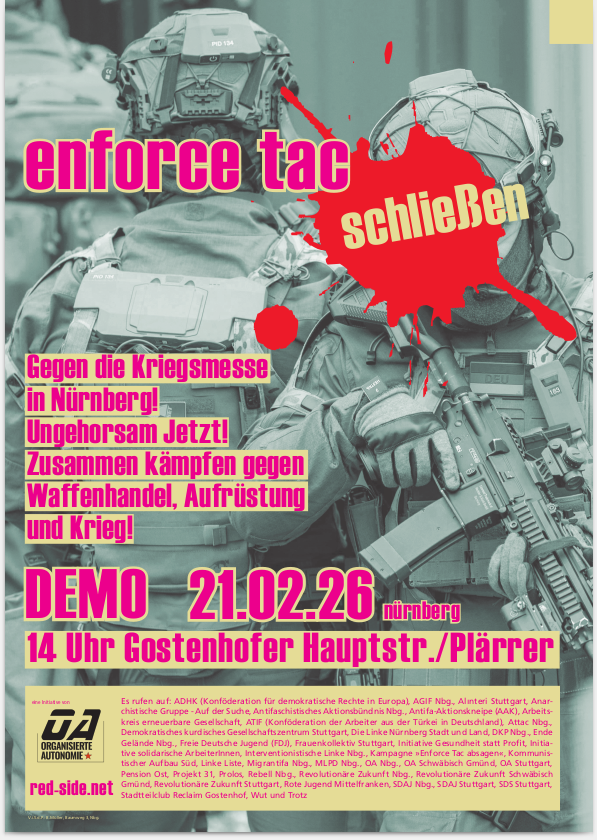 DEMO „enforce tac schließen“ 21.02.26 DKP-Nürnberg Veröffentlicht am Februar 4, 2026 von E429zFebruar 4, 2026 Demonstration am 21.02.2026 14 Uhr ab Nürnberg – Plärrer Gostenhofer Hauptstr.